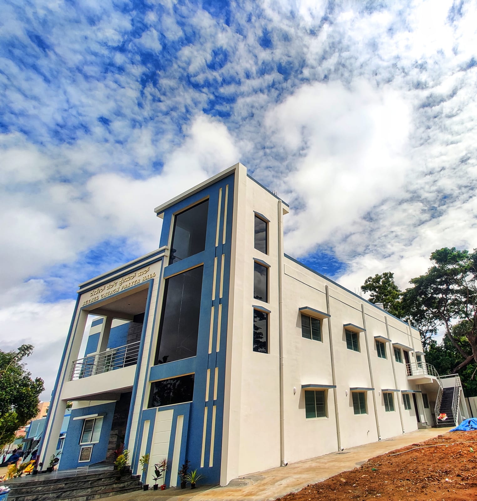 Architecturally, the exterior presents a bold yet balanced façade. The clean lines, geometric volumes, and contrasting blue – and – white color palette give the building a contemporary identity while remaining grounded and respectful in its context. The vertical design elements enhance visual height and presence, making the structure easily recognizable from a distance. A well – defined entrance with broad steps and a covered porch creates a sense of arrival and openness, inviting visitors into the space. The overall massing is symmetrical and orderly, reflecting stability and purpose – key qualities for a religious institution.